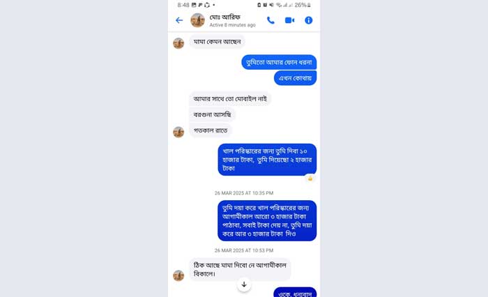 এই বিষয়ে জানতে চাইলে ফতুল্লার কুতুবপুর ইউনিয়নের ৮নং ওয়ার্ড বিএনপির সাংগঠনিক সম্পাদক অলিউল্লাহ খোকন মাস্টার সময় নারায়ণগঞ্জ’কে বলেন, ‘গত কোরবানীর ঈদের আগে এলাকার একটি খাল পরিস্কারের জন্য স্থানীয় গন্যমান্য ব্যক্তিগণ উদ্যোগ গ্রহণ করে। ফলে প্রতিটি বাড়ি ওয়ালার কাছ থেকে নির্ধারিত টাকা ধার্য্য করা হয়। যা দিয়ে খালটি পরিস্কারে ভেকু এবং ড্রাম ট্রাক ভাড়া সহ শ্রমিকদের পারিশ্রমিক পরিশোধ করা যায়। সেই সুবাধে আরিফ নামে ওই ব্যক্তির কাছ থেকেও খাল পরিস্কারের জন্য ডোনেশন চাওয়া হয়েছিল। সে ২ হাজার টাকা দিয়েছিল। তার প্রমাণ স্বরুপ ফেসবুক আইডির ম্যাসেঞ্জারে কথোপকথনের স্ক্রীন শট রয়েছে। এর বাহিরে তার কাছে কোনো প্রকার টাকা চাওয়া হয়নি।’