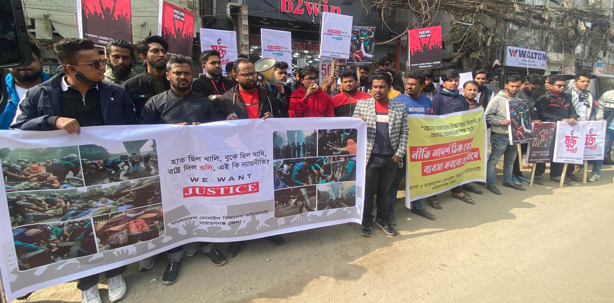 এনইআইআর সিস্টেম বাতিলের দাবিতে মোবাইল ব্যবসায়ীদের মানববন্ধন