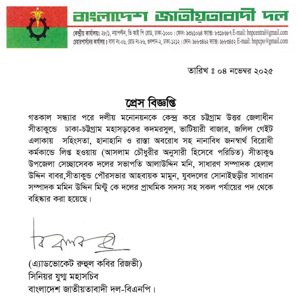 বিজ্ঞপ্তিতে জানানো হয়, সোমবার সন্ধ্যার পর সীতাকুণ্ডের কদমরসুল, ভাটিয়ারী বাজার ও জলিল গেইট এলাকায় মনোনয়নকে কেন্দ্র করে সহিংসতা, ভাঙচুর, হানাহানি,টায়ার পুড়িয়ে রাস্তায় আগুন ও সড়ক অবরোধসহ নানাবিধ অবৈধ কর্মকাণ্ড সংঘটিত হয়। এ ঘটনায় সংশ্লিষ্টতার অভিযোগে সীতাকুণ্ড উপজেলা স্বেচ্ছাসেবক দলের সভাপতি আলাউদ্দিন মনি, সাধারণ সম্পাদক হেলাল উদ্দিন বাবর, সীতাকুণ্ড পৌরসভার আহ্বায়ক মামুন এবং সোনাইছড়ী ইউনিয়ন যুবদলের সাধারণ সম্পাদক মমিন উদ্দিন মিন্টুকে দলের প্রাথমিক সদস্যসহ সকল পর্যায়ের পদ থেকে বহিষ্কার করা হয়েছে।