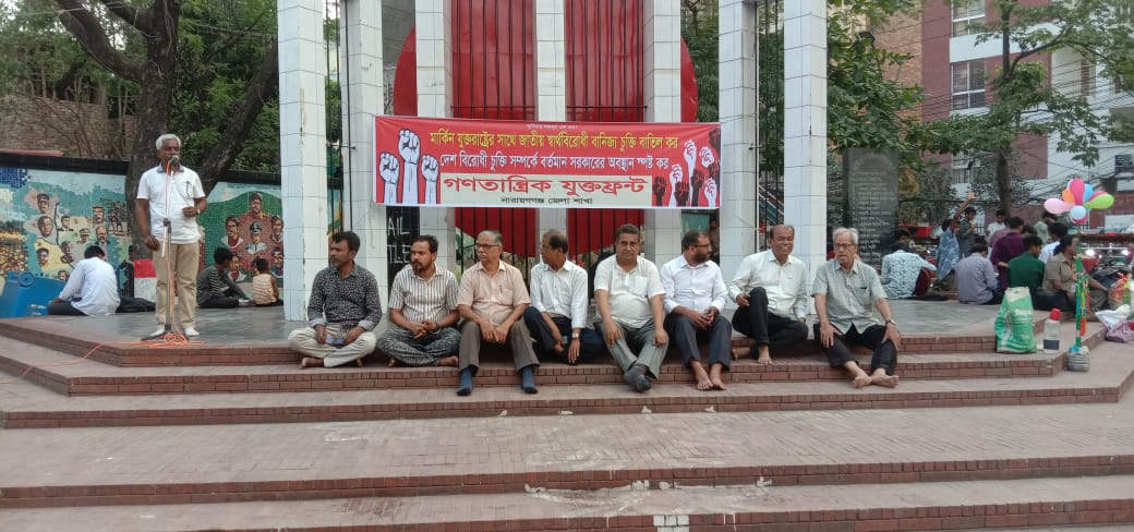 নারায়ণগঞ্জ সদর থানাধীন চাষাঢ়া কেন্দ্রীয় শহিদ মিনারে গণতান্ত্রিক যুক্তফ্রন্ট নারায়ণগঞ্জ জেলা শাখার উদ্যোগে মার্কিন যুক্তরাষ্ট্রের সাথে জাতীয় স্বার্থবিরোধী বাণিজ্য চুক্তি